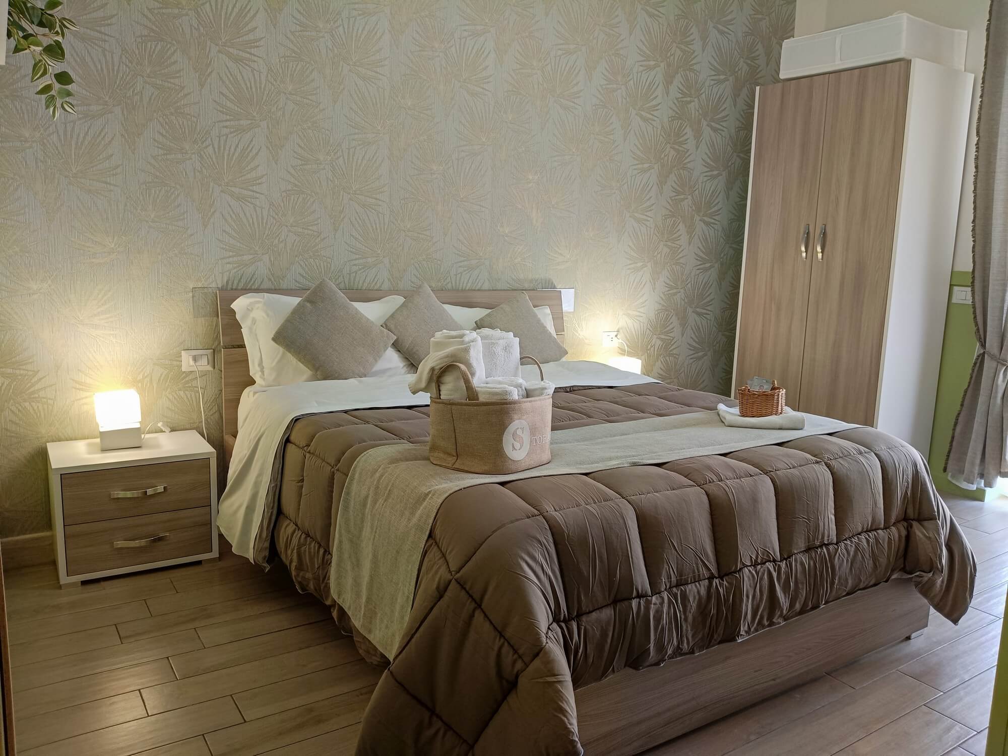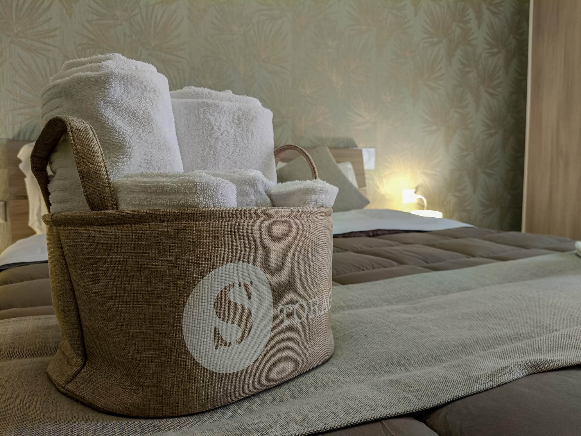 L'atmosfera calda e accogliente, impreziosita da una carta da parati elegante e lampade soffuse, crea un ambiente intimo e rilassante. Ogni dettaglio è curato per garantirvi un soggiorno indimenticabile, avvolti da freschezza e serenità.